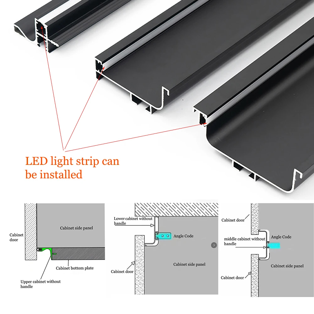 The gola handle system is primarily made of aluminum alloy, installed within the cabinet frame to achieve a handle-less design. These concealed handles provide a gripping channel, enhancing both the aesthetics and practicality of the kitchen cabinets.